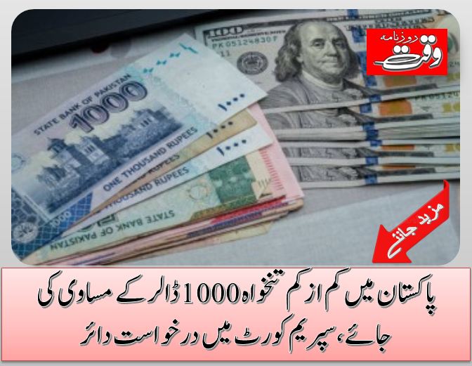 لاہور(ویب ڈیسک)پاکستان میں کم از کم تنخواہ ایک ہزار ڈالر کے مساوی کرنے کی درخواست سپریم کورٹ میں دائرکردی گئی۔