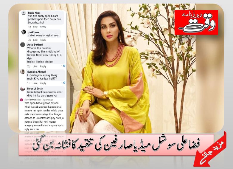 پاکستان کی مشہور ماڈل، اداکارہ اور میزبان فضا علی ایک بار پھر سوشل میڈیا صارفین کی تنقید کا نشانہ ہیں۔ بہت سے لوگوں نے خود فضا کو اس میں اپنی تصویر شامل نہ کرنے پر تنقید کا نشانہ بنایا، کیونکہ مداحوں کے مطابق وہ خود بھی متعدد کاسمیٹک طریقہ کار اختیار کرچکی ہیں۔سوشل میڈیا صارفین کا کہنا تھا کہ انھیں فضا علی سے یہ توقع نہیں تھی کہ وہ اپنی ساتھی اداکاراو¿ں سے متعلق اس طرح کی گفتگو کریں گی۔